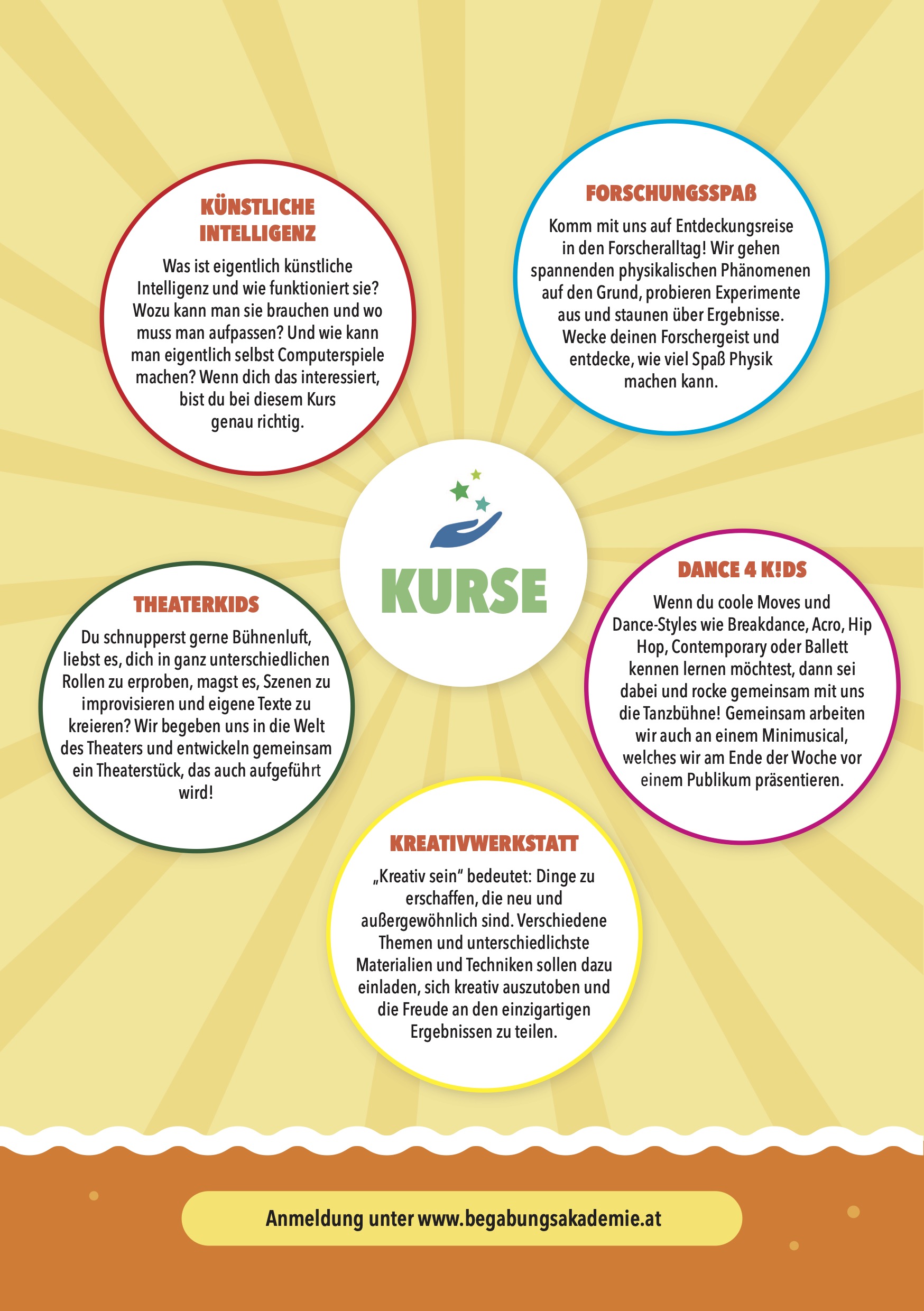 Eine Woche lang spezialisieren sich die Kinder in Kleingruppen mit Experten und Expertinnen in den verschiedenen Themenbereichen. Folgende Kurse werden diesen Sommer angeboten: