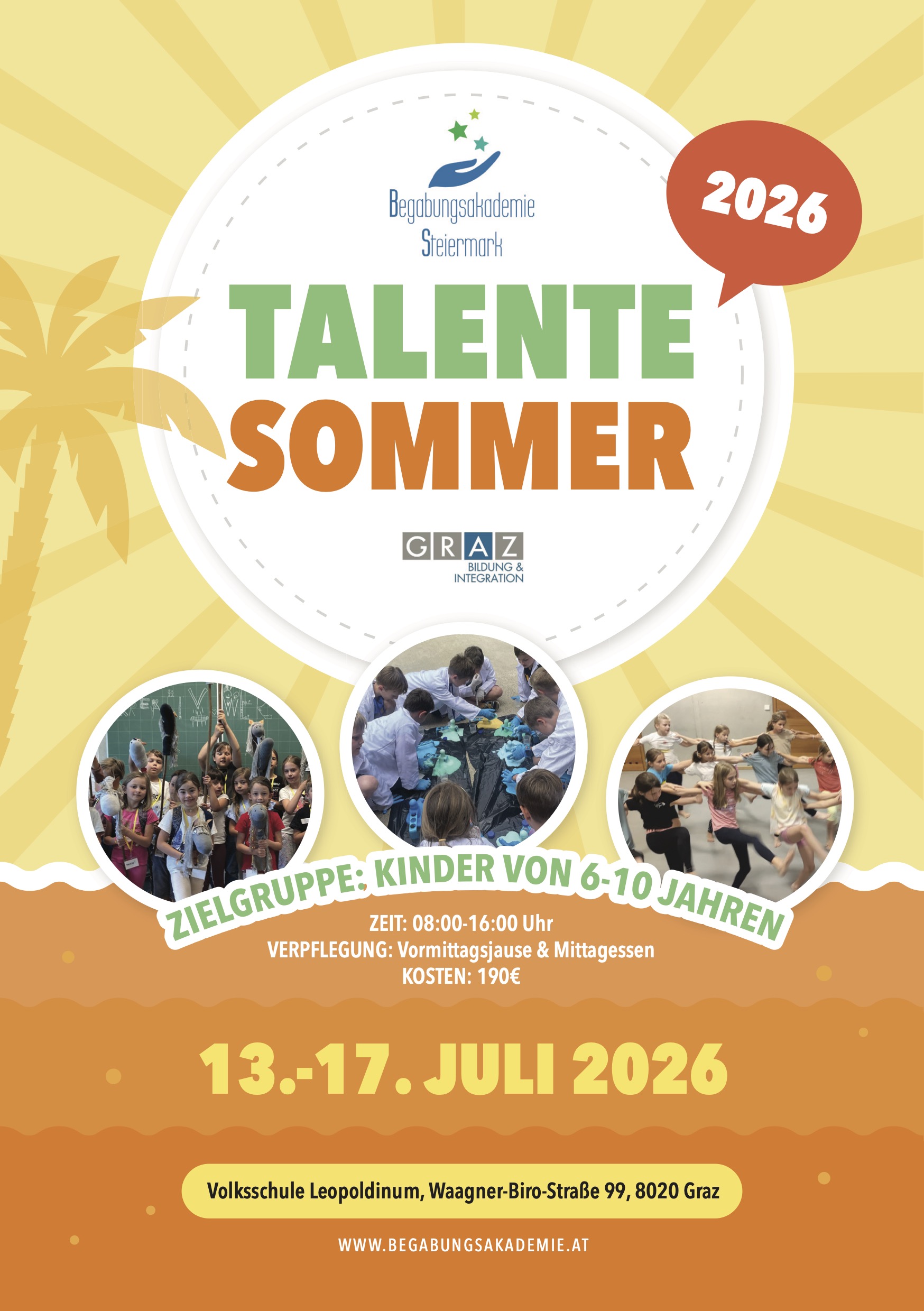 Bereits zum siebten Mal fand heuer in Graz der Talente Sommer der Begabungsakademie Steiermark statt. In der ersten Ferienwoche wurden 74 Volksschulkinder von 07.07.2025 – 11.07.2025 in Kleingruppen von Experten und Expertinnen in den verschiedensten Themenbereichen gecoacht. Die jungen Talente konnten sich für eine Woche in ihren spezifischen Interessen vertiefen und die individuellen Begabungen weiterentwickeln. Zwischen den Kurseinheiten gab es ein ausgiebiges Freizeitprogramm inkl. Vormittagsjause und Mittagessen. Durch die finanzielle Unterstützung der Stadt Graz und des zuständigen Stadtrates Kurt Hohensinner wurde das Kursangebot für alle sozialen Schichten mit einem geringen Teilnehmerbeitrag zugänglich. DANKE an das gesamte Team des Talente Sommers 2025 für den großartigen Einsatz und die unvergessliche Zeit!